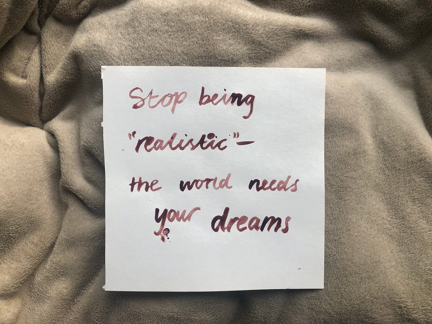 So don’t be so fucking selfish, don’t deprive the world of a better future by saying your dreams are unrealistic. A future that comes from your deepest desires is better than this broken system we’re already living in. We need a better world. We need your dreams. Do us all a favour and please be unrealistic.